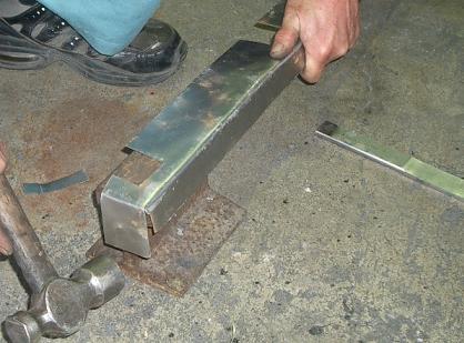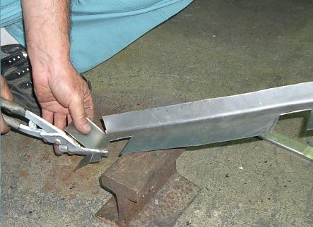 | スタッフのTさん:腐ったところは、何か鉄板でも張るんだけ〜?(甲州弁) 修行人:そう思って、手曲げ板金で、こんなの作っちゃいました・・・ (結構参加している) コレをパッチ当てで処理しましょう! スタッフのTさん:寸法はまあまあ、だけんど、 ちっと収まりがわり〜ナ〜(甲州弁) |