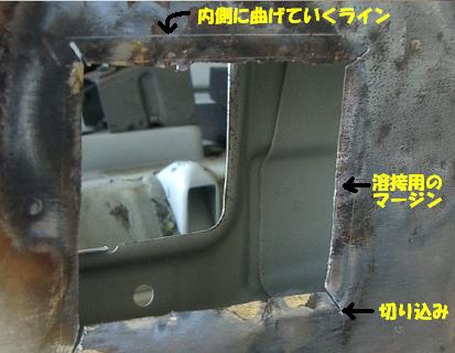 | ・・・・・といろいろ協議した結果修行人は周りの意見もかえりみず・・・・突っ走るのです。 (この性格が、そもそも、失敗の原因・・・汗) 修行人:こうなったら、鉄板切り張りでGO!GO!(勢いだけは一人前です。) ・・・・・ということで、思いっきり切ってしまいました・・・・・・・ レストア侍ここで登場:コノ修行人はまだ溶接が下手デ・ゴザンス!薄板の突合せ溶接はまだまだ無理じゃ〜! 修行人:それでは、幼稚園の頃、紙でぶ〜ぶ(車)を工作した手法で行ってみよう!のりしろでなく、溶接しろを作って、中途半端な溶接をカバー出来るかな〜????