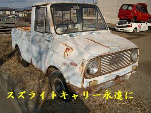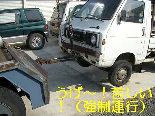 修行人:アレ??涙で、お見送りしたはずが、まだ、ちゃっかりST20キャリイがそこに隠れていました・・・新型キャリイに並んでいても、型落ちは見え見えです・・・実は、引取業者が昨日これなかったのです・・・・汗 レストア侍:この、荷車(キャリイ)は、おそらくこのまま、圧縮工場へ直行間違いないな・・・・ 修行人:何で?わかるんですか?? レストア侍:部品を取る車は、こんなに荒々しく首吊り状態で、もって行かず、やんわりともっていくんじゃ!! 修行人:なるほどね・・・これで、本当にお別れです・・・ ST20キャリイ・お疲れ様でした&修行させていただきありがとうございました!! |
