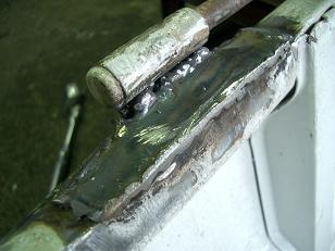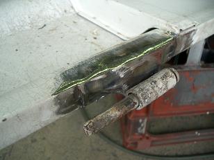 | ・・・グラインダーとベルトサンダーで溶接面を削ると強度的には完全にボディーと一体化しました。 修行人:いまいち美しくないな〜(欲張り・・・・) また、巣の入ったところを追いかけると、大変なことになるし(既に学習済み) 熱で鉄板も歪んでしまうの、今日はこの辺で勘弁してやろう!(強気な意見?)