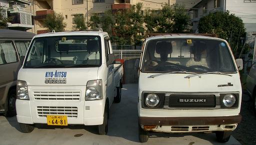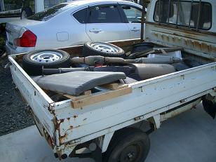| 例によって、軽トラ一杯に、中古部品を仕入れてきました! 旧規格の軽トラの荷台は新規格の軽トラにぴったりおさまりました。 他、バンパー、ラジオ、マフラー、セルモーターなどの消耗品も入手!