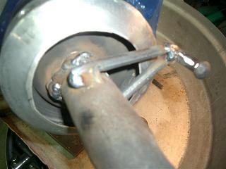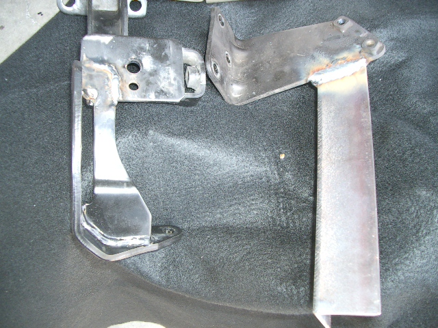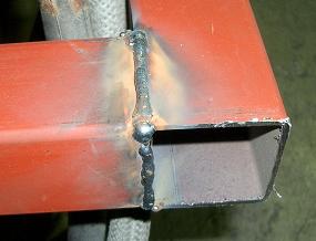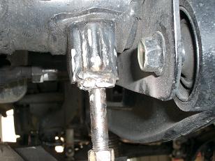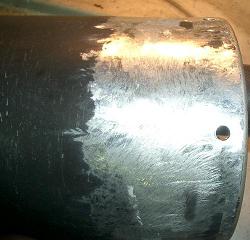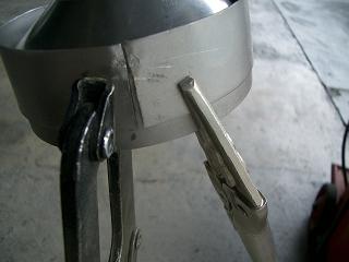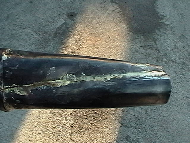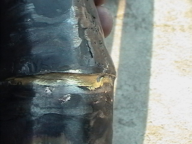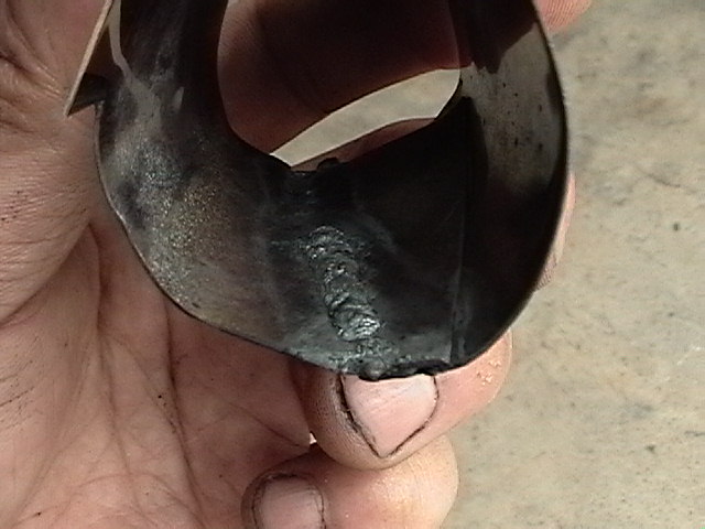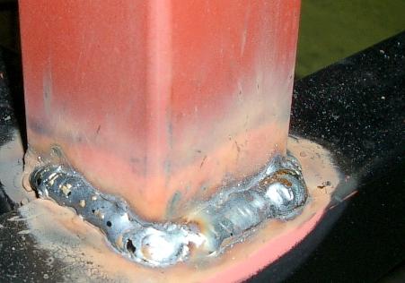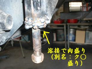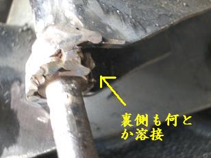 変形した角度は、折れないようにゆっくりと元へ戻し、ブラケットとの隙間部分をバッチり溶接!その後、ク○いや、もとい、肉盛り溶接して、太くしていきます。 (ちょうど、かりくびの太い所を基準に全周、溶接その後上部へ肉盛りしていきます。) |