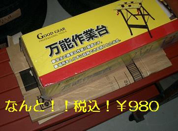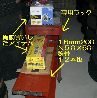 ついでに、今回、衝動買いしてしまった品々の紹介。木工用万能折りたたみ式作業台、なんと税込¥980也値段見てビックラ!何か?キャシャかな?と思いつつも、値段につられてGET!修行人の荒業に何処まで、耐えられるのでしょう?? それと、これは、お買い得品!高速鉄筋カッターを探していたら、電動丸ノコ半額お買い得品発見!”HIYACHI”なんてまがい品でなく、ちゃんとメーカー品の”HITACHI”(日立)ですよ、値札に×して、手書きで無造作に値段書いてあるので、恐る恐るレジにいったら、本当!税込¥6400でした・・・・ これに、鉄骨用チップソーをつけて、鉄骨を八つ裂きに出来るか??? つづく・・・ |