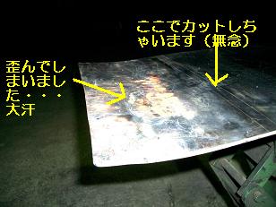 ここで、早速!お楽しみの?問題発生ですね・・・ 鉄板が溶接の熱で、反り返ってしまいました。本当はおおざっぱなものでしたら平面出しとか、組み立てが出来るほどのプチ定番状態にしたかったんですけど・・・・(残念) ・・・・って事で、せっかくここまで作ったんだから、何とか形にせねばと・・・・炙っちゃったりしています・・・(造船所の本当の職人さんが、炙り曲げで船の局面を作っているものの、超!真似事)