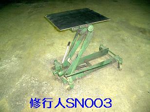 ここで、修行人SN003バトル作業台の機能を紹介させて頂きます。 バトルモード:立ち位置で工作物を加工・溶接するときに使用いたします。 移動収納モード:座位置での作業や安定した移動をするときに使用。 その他:天板は鉄板ですので、溶接や加工が遠慮なくじゃんじゃん出来ますし、土台はミッションジャキなので、重量物も立ち位置まで持ち上げられます。 |