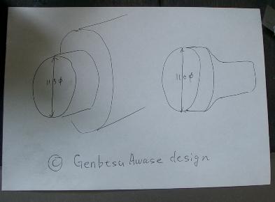 ということで、そこら辺に、インナーサイレンサーがころがっていたので、合せてみると、ガバガバにゆるいです・・・・汗 そんな感じで、挫折していると・・・デザイナーのMr.Genbutsu Awase氏がスケットをくれました・・・・・ 採寸してくれたようです。マフラーの出口の内径が115パイ、サイレンサーの外径が110パイのようです。
